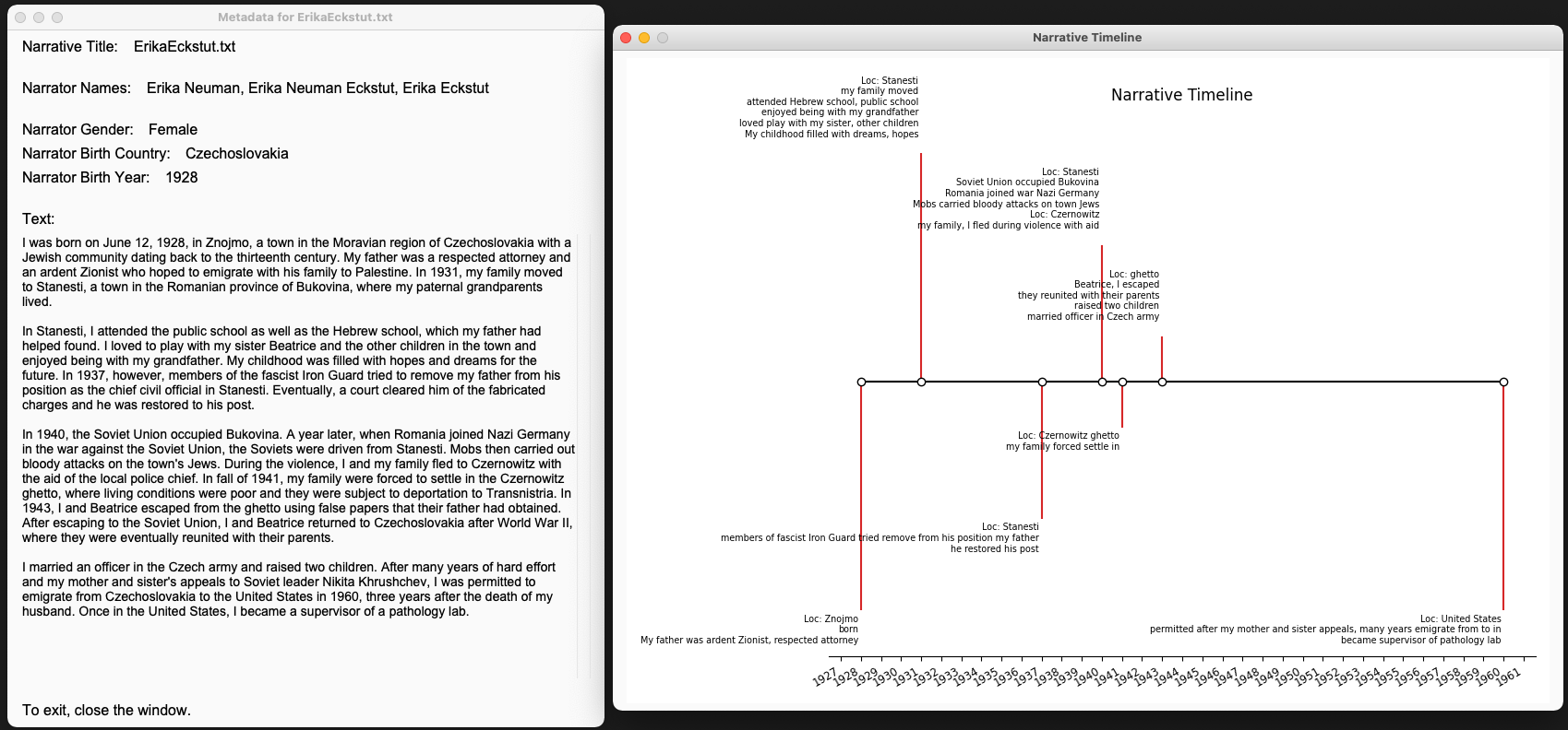 At this time, we are working on the core functionality and only the first four buttons are functional. For example, we have successfully used spaCy's dependency parsing to output a narrative timeline. An example is shown below. The output is promising but is still basic with errors and missing information. Also, we need to change the output from text to triples in a knowledge graph. That is our goal for our work in June.